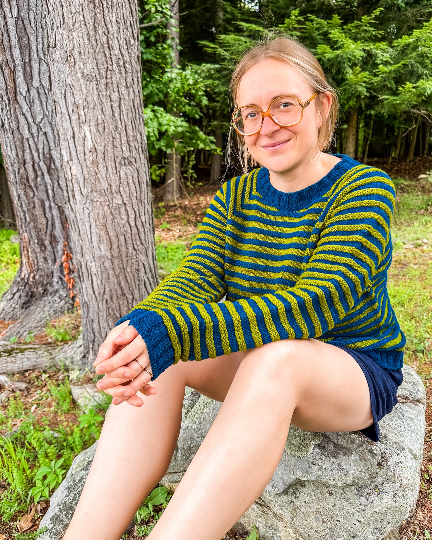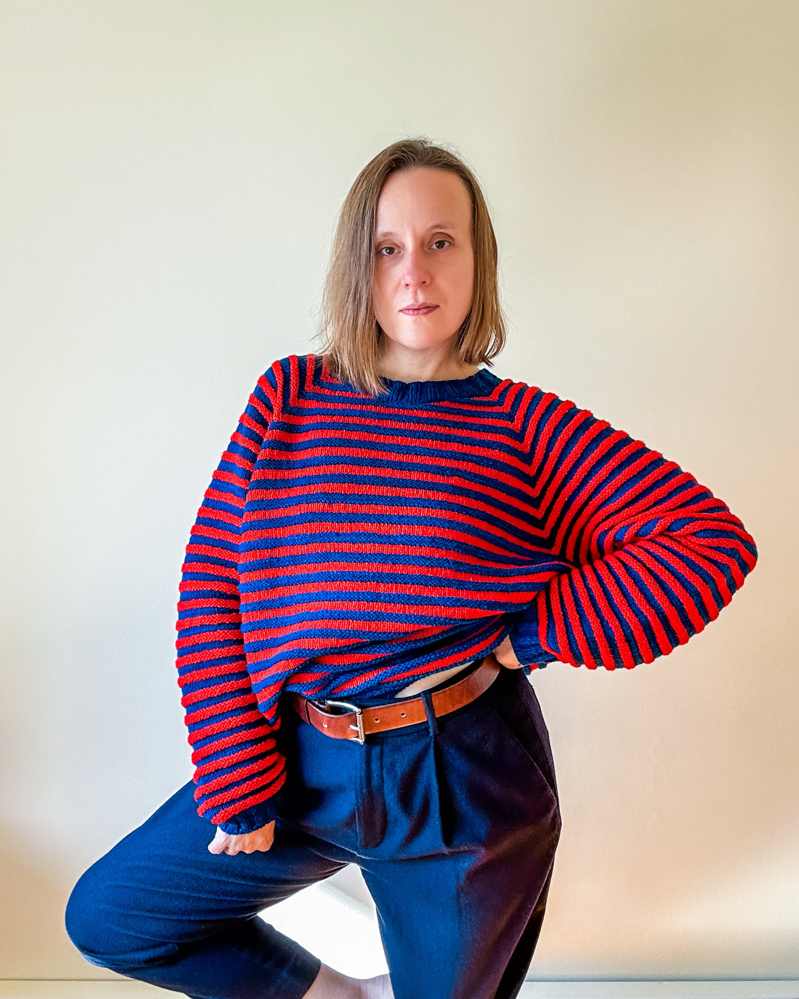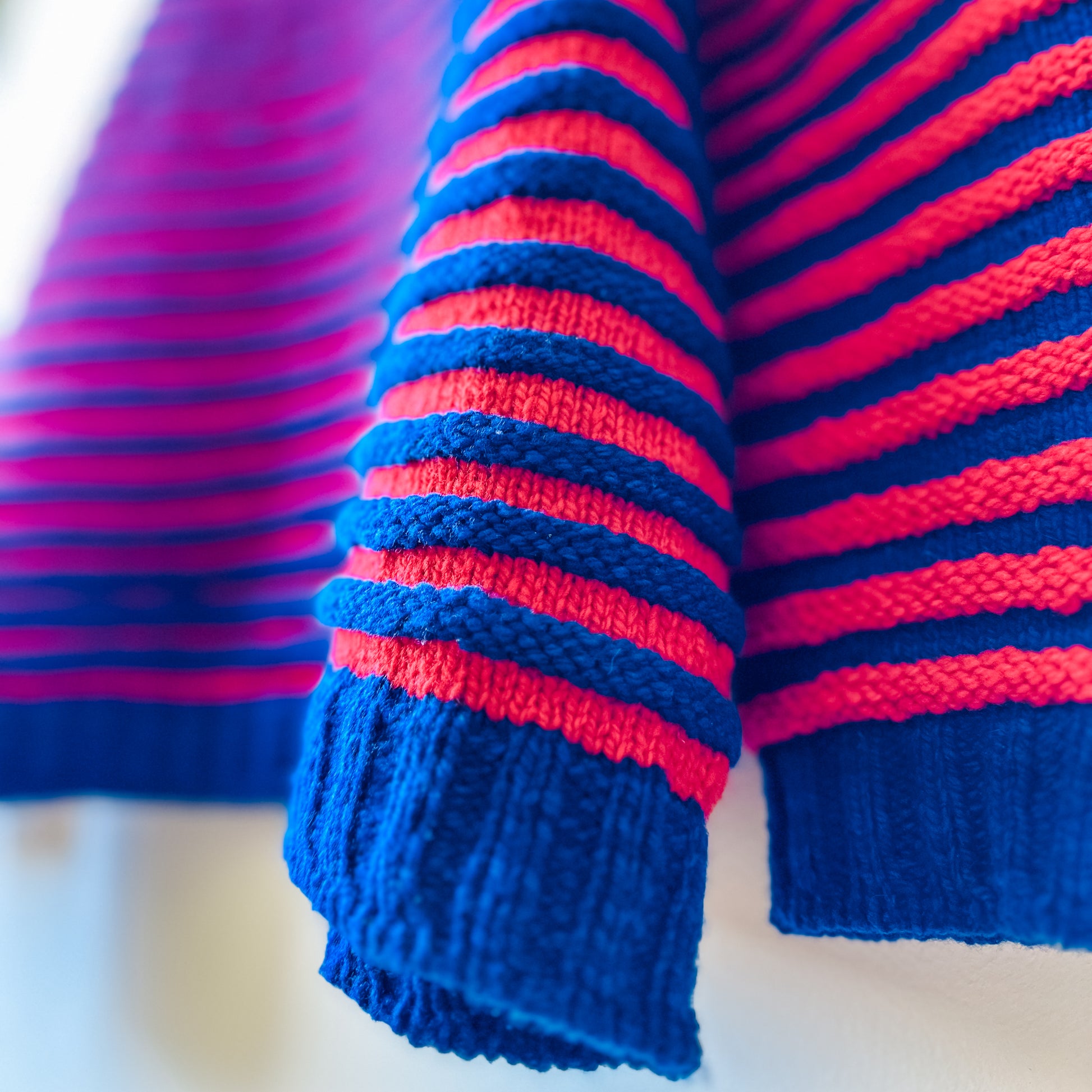 POV Pullover is a top-down, seamless raglan in two colors. Alternating stockinette ↔ reverse-stockinette stripes create a point-of-view shift—the look changes as you move. Short-row shaping forms a comfortable crew neck, and it’s worked in the round with minimal finishing for a relaxed, easy-to-wear silhouette; suitable for adventurous beginners and beyond.