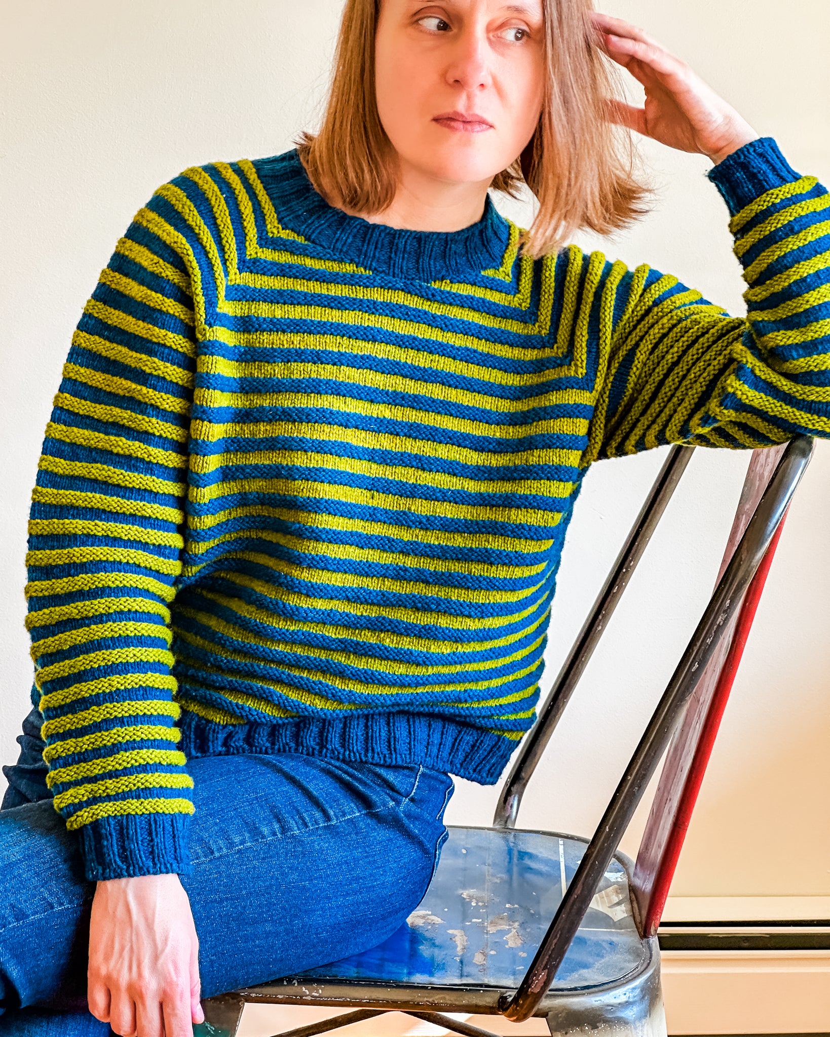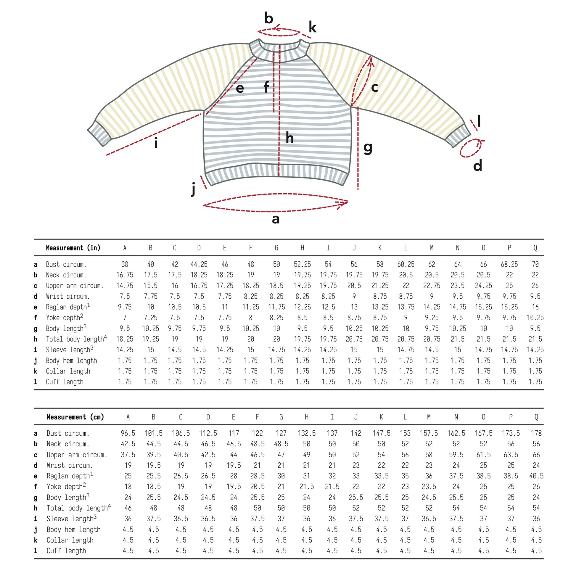 Top-down raglan; short-row neckline; tubular cast-on and tubular bind-off; lifted increases; jogless stripes. Schematic included. Video support via links & QR codes.